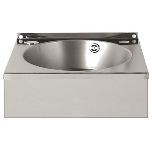 Standard sized stainless steel hand wash basin complete with drain boss, front apron and overflow. No chain supplied. For use with most basin taps (not included).