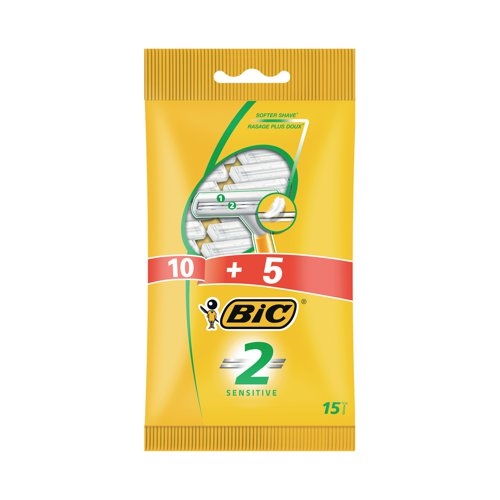 A pack of 15 (10 plus 5 extra) BIC 2 Sensitive disposable twin-blade razors for men that offer good value with two stainless steel blades and a long handle for accurate control. Eliminate the stubble and enjoy a quick no-nonsense shave.