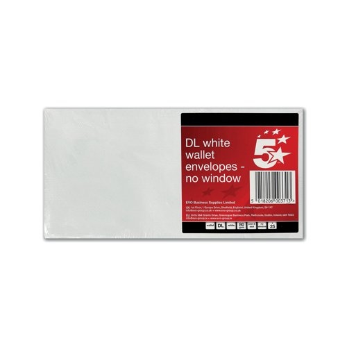 5 Star DL Envelopes Plain Wallet Self Seal 80gsm White (Pack of 25) FS600371