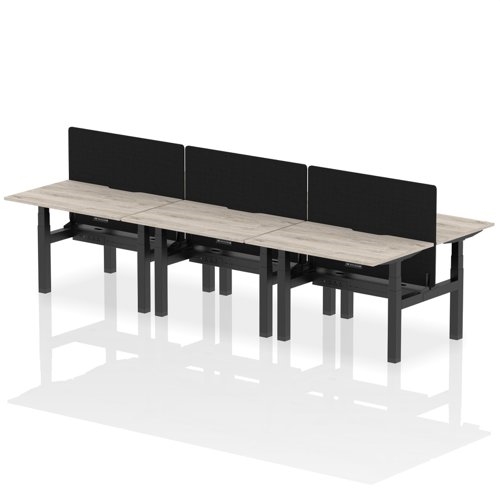 Air Back-to-Back 1200 x 800mm Height Adjustable 6 Person Office Bench Desk Grey Oak Top with Scalloped Edge Black Frame with Black Straight Screen