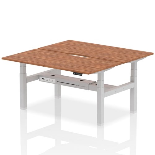 Air Back-to-Back 1600 x 800mm Height Adjustable 2 Person Office Bench Desk Walnut Top with Scalloped Edge Silver Frame