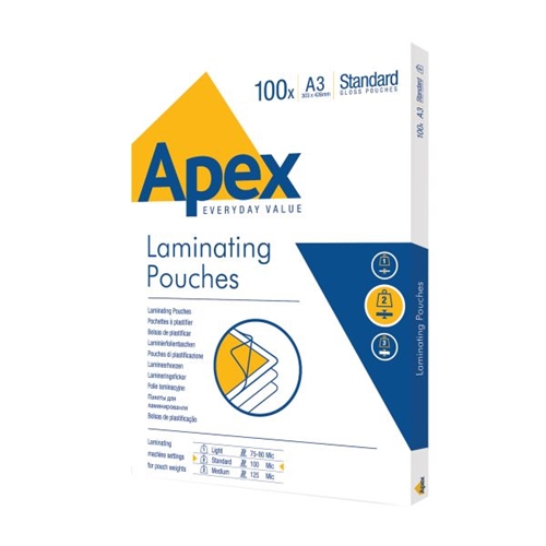 Apex Laminating Pouches A3 Standard Duty - 5 x Packs of 100 (500 Pouches)