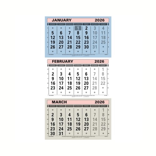 This 3 month view hanging wall calendar is ideal for planning meetings, appointments and other tasks in advance. The calendar shows the current, previous and forward months at once, or could be altered to show the current and 2 following months. It includes an At-A-Glance date indicator for easy reference and all 3 pads easily tear off to change configuration every month, making it a long lasting and effective planning tool.