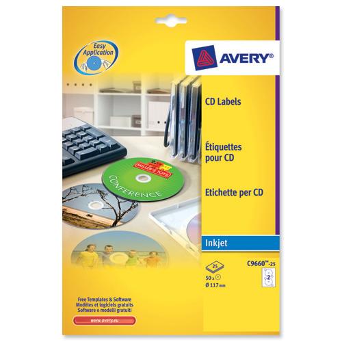 Avery C9660 Full Face Inkjet CD Labels Glossy 117mm Dia. Ref C9660-25 - 25 Sheets