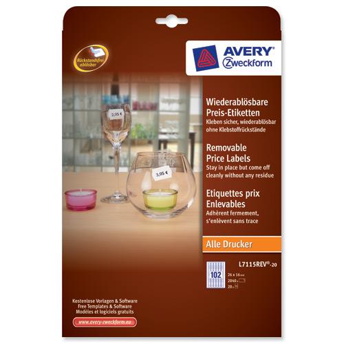 Avery Price Labels Removable 102 per Sheet 26x16mm White Ref L7115REV-20.UK - 2040 labels