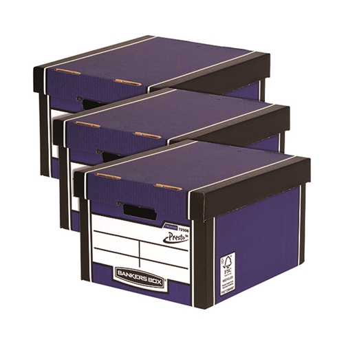 - Bankers box with Presto instant assembly pop-up system for easy set up