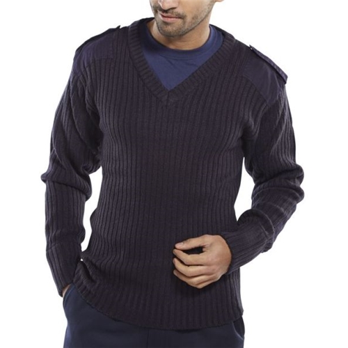 Military style security sweater made from 100% rib knit acrylic. Military style features shoulder and elbow patches and epaulettes on shoulder. Made from thick material for added warmth.