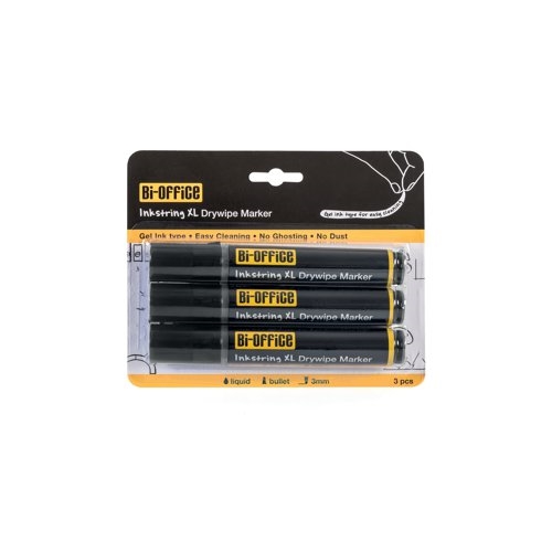 These Bi-Office Inkstring XL Drywipe Markers are an innovative Drywipe Marker, designed with a gel type ink, providing a unique and smooth writing experience for the customer. These Bi-Office Inkstring Markers are ideal to be used on all types of whiteboards, including glass whiteboards, at the office, schools, class rooms, meeting rooms, and even at home. The InKstring markers are available in three colours, black, blue and red, to facilitate the communication through the use of different colours, when presenting, teaching, brainstorming, and the like.