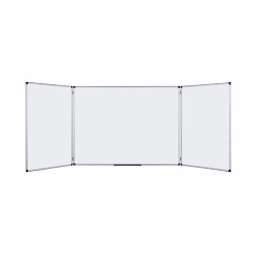 A perfect fit for teaching and learning, the Bi-Office Trio Magnetic Whiteboard is great for applying knowledge, and developing skills. The dry wipe lacquered steel surface is suited for frequent use, writing, and erasing (lifespan of 10 years). You can write text, draw, or make diagrams, erase them and do it all over again. Plus, you can use magnets to display information. Efficient communication is the key to success. Explain subjects, brainstorm ideas, and be creative. Decide, plan and analyse. All in one place. This makes it a must-have item for training centres, schools, labs, and workplaces. Besides, it’s the most cost-effective solution. Close it to save even more room space and increase the functional area. Fix the board onto the wall with screws that go through the holes in the plastic corners. This is the simplest, sturdiest, and most robust mounting system around. The set includes a tray that is easy to attach to the board, by clipping.