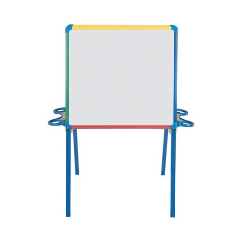 Learning can be fun with the Bi-Office Schoolmate Magnetic Whiteboard Easel. The lacquered steel surfaces are suited for frequent use with a 10 years lifespan. Thanks to both drywipe surfaces, its ok to try and make mistakes, as they can erase and just start again. Pictures and other items can be posted with magnets. They can also write and draw on paper sheets to be hung on the top hooks. It can be used in many ways from developing writing readiness and preparing children for pencil and paper, to playing learning games to consolidate understanding. Also, this easel is great for standing hands-on and fun play experience. Besides, it ensures group activities and student connections in an engaging setting. Its coloured round edges and corners make this lightweight yet resistant easel a safe and engaging method for kids to develop finger dexterity and good pencil grip. Just fold the A-frame flat when they are done and store it away. The set includes cups for accessories like drywipe markers and others on both sides of the easel.