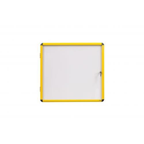 Bi-Office Enclore lockable display case with a magnetic Drywipe lacquered steel surface, suited for frequent use. Write notes and post information with any type of magnets. This is a strong, secure, and lightweight solution to display important notes, pictures, and so on, in the common areas of factories, warehouses and other industry facilities. The aluminium trim features safe rounded corners and is yellow-coloured for increased visibility. There is clear visibility of the displayed items due to the swinging acrylic door, which can be locked to protect the inside materials from hampering, manipulation, or the weather. The display case comes with 2 keys, so you can keep a key in a safe location, to use as a spare if the other one gets lost. The set also includes a wall mount kit for easy installation.
