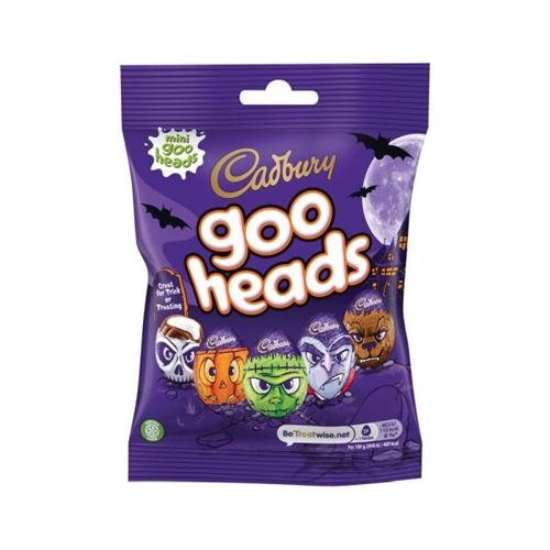 A bag of individually foil wrapped Cadbury Goo Heads Creme Egg minis. A Halloween themed pack, with individual foil wrapped Goo Head minis. Great for trick or treating.