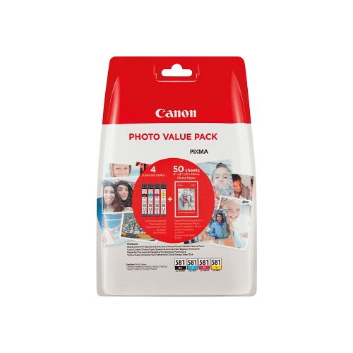 This Canon CLI-581 inkjet 4-cartridge value pack contains one cyan, magenta, yellow and black ink cartridge for printing documents and photos at very high quality and a pack of 50 sheets 4 x 6 inch PP-201 Glossy II Photo Paper Plus. This set of four 5.6ml ink cartridges provides long lasting prints and fade resistant finishes thanks to the ChromaLife100 system with 200 pages in black and 250 pages in colour at ISO/IEC 24711 standard.
