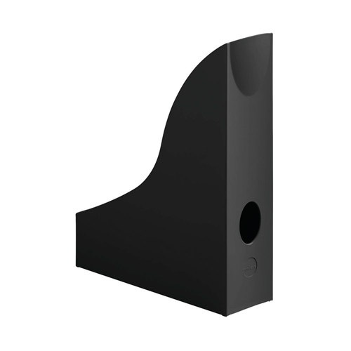 An Eco-friendly magazine rack that is not only good for the planet but also looks great on the desktop with Blue Angel certification for stringent environmental and performance standards. This stylish magazine rack is perfect for storing A4 format documents, magazines, catalogues and brochures. Featuring a finger grip hole to make it easy to remove from a shelf, this black magazine rack measures 73x241x306mm.