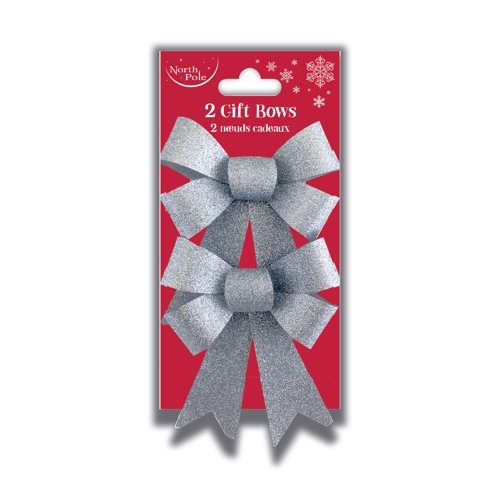 2 glitter gift bows per backing card. Each bow measures 130mm x 145mm. Silver glitter finish. Pack of 6.
