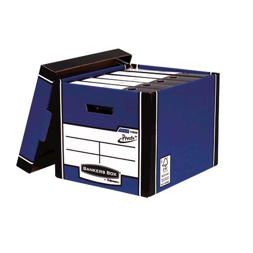 This environmentally friendly Fellowes premium storage box is made from 100% recycled board and is ideal for storing records and archiving documents. Featuring unique Presto Instant Assembly, this box sets up 16x faster than a manual box - simply push the corners together and the box is ready for use. Up to 80% stronger than a standard storage box, this premium box features double ends, sides and base, for maximum stacking strength up to 6 high. These corrugated cardboard storage boxes accommodate A4 and foolscap documents, folders, ring binders and Premium transfer files and are the perfect height for racking systems. Each tall blue box measures W330 x D381 x H298mm. This pack contains 10 boxes.