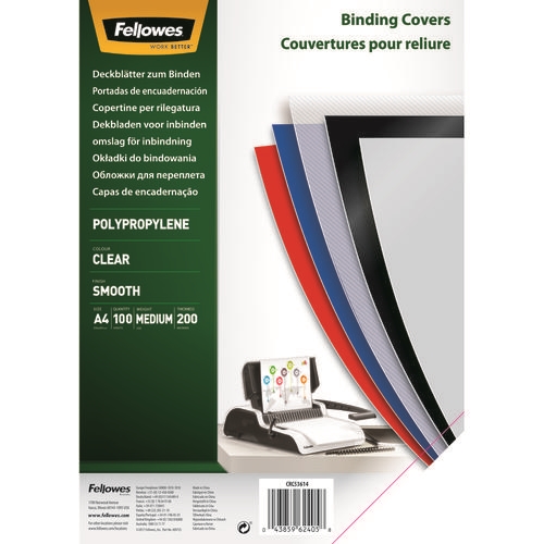 Fellowes Polypropylene covers offer an alternative to PVC covers with the added environmental benefits. The polypropylene range is available in matt, lines or smooth finish in a selection of popular colours. Available in 100 packs of A4 covers.