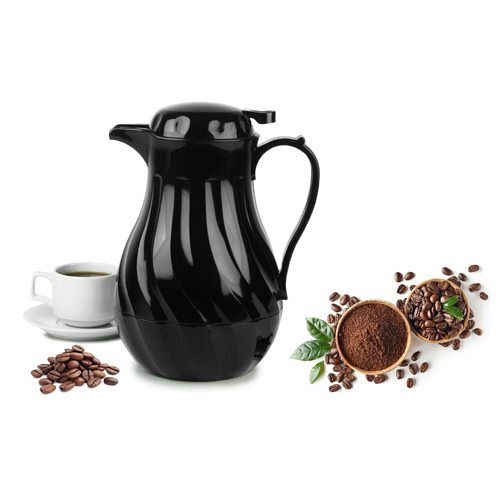 - Constructed with heavy-duty plastic, this insulated server is designed to withstand the wear and tear of daily use. The push-button cap ensures that your beverage stays securely inside the server and does not leak, while the sleek black swirl design adds a touch of elegance to your tabletop.