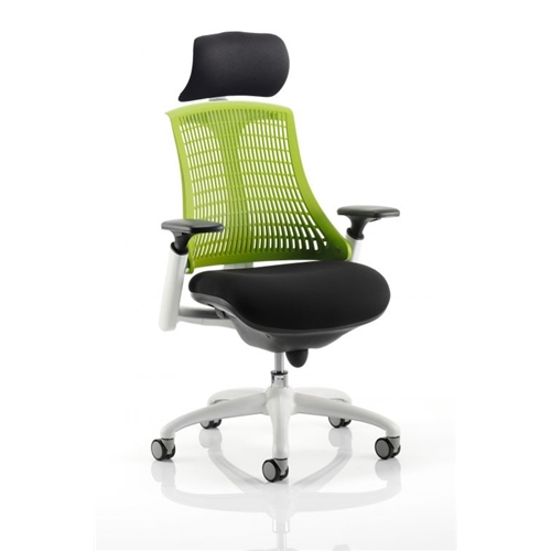 Flex Task Operator Chair White Frame Black Fabric Seat With Headrest Green Back