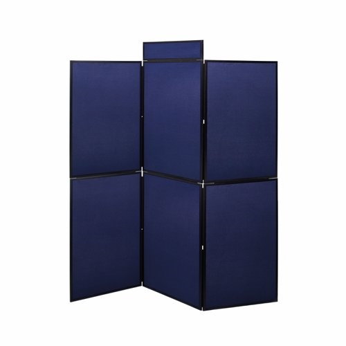 Plastic framed panels with header for easy display system. Floor standing 6 panel display board blue felt with header.