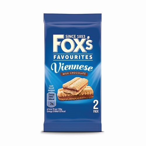 Fox's Viennese Chocolate Biscuits are delicious Viennese biscuits sandwiched together with milk chocolate. Ideal for hotels, conference and hospitality venues. Suitable for vegetarians. Each pack contains 2 biscuits. 48 packs supplied.