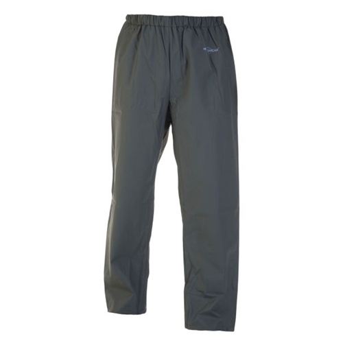 Lightweight and breathable waterproof trousers suitable for agricultural and industrial use or leisure. Made from 170gsm PU coated polyester fabric. Features adjustable leg opening with press studs and elasticated waist. Conforms to EN343 Class 3 Water penetration and EN343 Class 1 Breathability.
