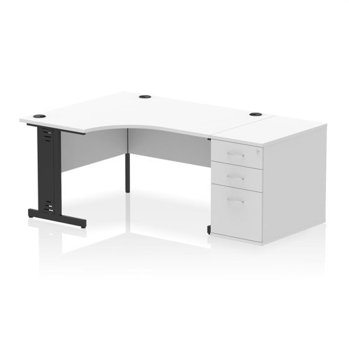 Impulse 1400mm Left Crescent Office Desk White Top Black Cable Managed Leg Workstation 800 Deep Desk High Pedestal