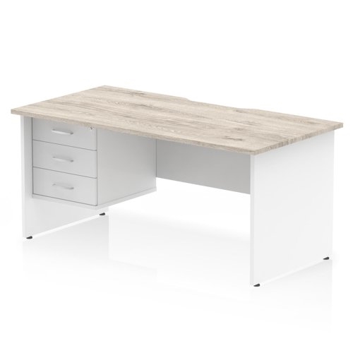 Impulse 1600 x 800mm Scalloped Edge Straight Office Desk Grey Oak Top White Panel End Leg Workstation 1 x 3 Drawer Fixed Pedestal