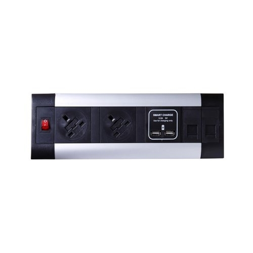 Impulse Desktop Module 2 x UK Sockets, 1 x Neon Switch, 1 x 500mm Lead to 3 Pole Connector with 1 x Smart Charge & 2 x CAT5E Data in Black