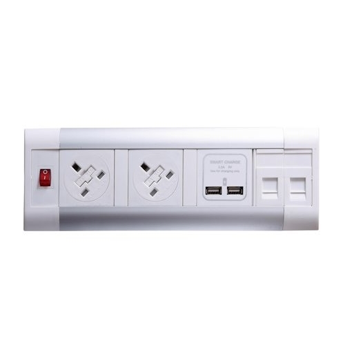 Impulse Desktop Module 2 x UK Sockets, 1 x Neon Switch, 1 x 500mm Lead to 3 Pole Connector with 1 x Smart Charge & 2 x CAT5E Data in White