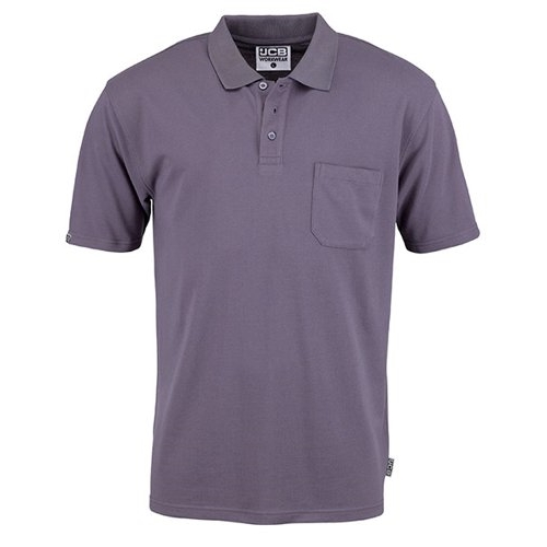 JCB Essential Grey Polo Shirt. 65% Polyester 35% Cotton 220gsm. Ideal for branding with your Company logo. Three button front placket. Left chest pocket. Minimal JCB woven branding.