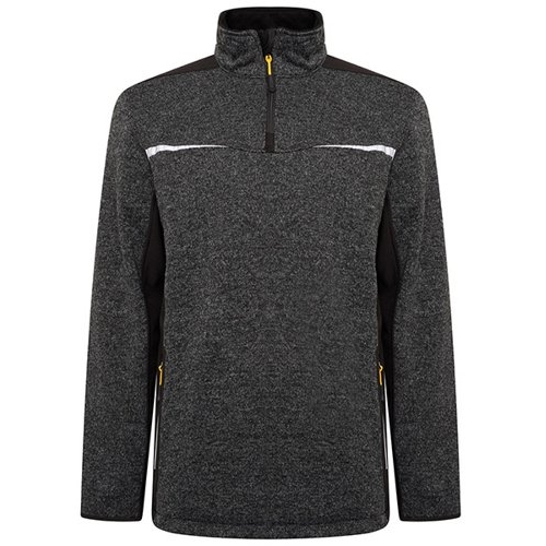 JCB Trade Elmhurst Ii Grey. Knitted fabric: 100% polyester 370gsm. Softshell fabric: 100% stretch polyester 280gsm. Quarter zip style. Two side zip pockets. Elasticated taped cuffs. Elasticated drawcord around bottom hem. Reflective tape on chest and shoulders. Reflective JCB Branding.