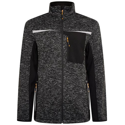 JCB Trade Essington Ii Full. Knitted fabric: 100% polyester 370gsm. Softshell fabric: 100% stretch polyester 280gsm. Full zip style. Two side entry zipped pockets. Zipped left chest pocket. Elasticated taped cuffs. Elasticated drawcord around bottom hem. Reflective tape on chest and shoulders.
