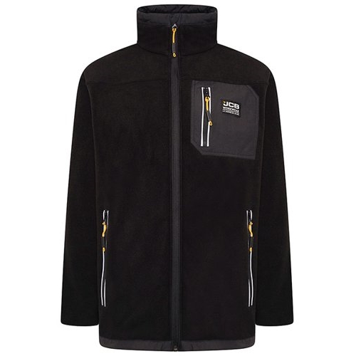 JCB Trade Fleece Full Zip. 100% Polyester Polar Fleece. 300gsm. Cordura fabric elbow patches for durability. Ripstop front chest pocket with YKK zip and reflective piping. Side pockets with YKK zip and reflective piping. Woven JCB logo on chest. JCB Branding.
