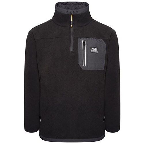 JCB Trade Heavyweight 1/4 Zip. 100% Polyester Polar Fleece. 300gsm. Cordura fabric elbow patches for durability. Ripstop front chest pocket with YKK zip and reflective piping. Side pockets with YKK zip and reflective piping. Zipped air vents under sleeves. Woven JCB logo on chest. JCB Branding.