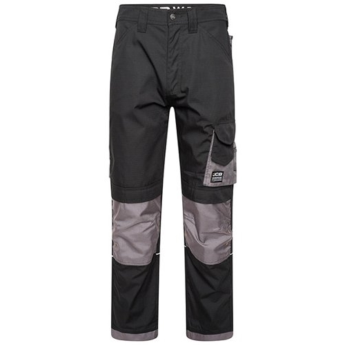 JCB Trade Black/Grey Rip Stop. 65% Polyester 35% Cotton Rip Stop Fabric 200gsm. Top loading Cordura knee pad pockets. Multifunctional pockets. Triple stitched flat felled seams. Cordura reinforcements at the bottom of both legs. Reflective piping on back of leg. Two back pockets. right with Velcro pocket flap.