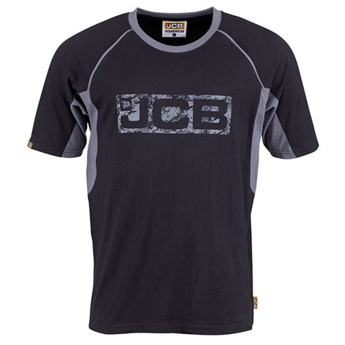 JCB Trade Black/Grey T-Shirt. 100% Cotton 180gsm. Distressed JCB branding across chest. Contrast collar and piping. Woven JCB branding on right arm and left side seam.