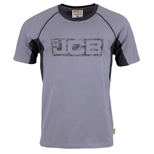 JCB Trade Grey/Black T-Shirt. 100% Cotton 180gsm. Distressed JCB branding across chest. Contrast collar and piping. Woven JCB branding on right arm and left side seam.