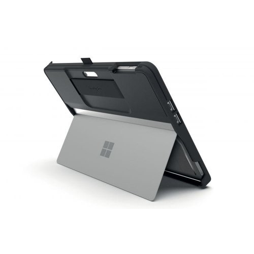 Ready for anything, the BlackBelt™ Rugged Case provides a compact design with all port access, heat dissipation channels, a self-adjusting hand strap that allows the device to lie flat, a stretch band to secure and protect your Type Cover or Signature keyboard when not in use, a removable Surface Pen holder (Surface Pen not included), full access to the Surface Pro kickstand, together with cable lock and privacy screen filter compatibility.