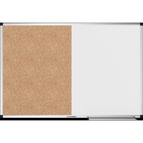 This is a functional whiteboard and pinboard designed for occasional use in either an office or home office. It has two halves - one with a magnetic lacquered steel board surface that can be written on with dry erase whiteboard markers, and the other half has a pinboard with a natural cork board surface. The frame is made of aluminum and comes with grey plastic corner caps (Pantone 433C). It can be mounted either horizontally or vertically to suit your preference.