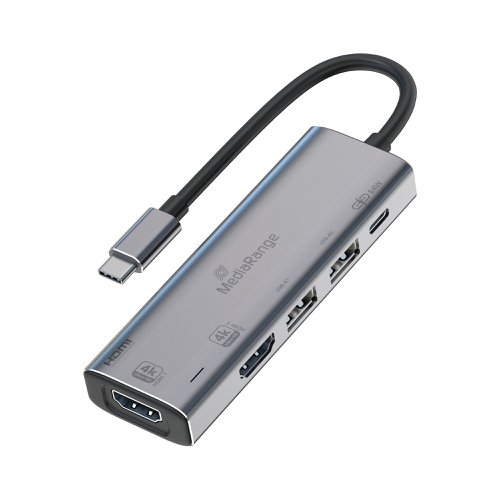 The MediaRange USB Type-C hub with five ports is ideally suited for connecting up to two USB 2.0 devices (e.g. mouse, keyboard, printer, external hard drive) and 2x HDMI monitor with a resolution of up to 3840 x 2160 pixels at 30Hz and a USB-PD Type-C charging slot with a charging power of up to 84 watts. Perfect for expansion and connection to a smartphone, tablet PC, computer or laptop with USB Type-C socket. The hub is bus-powered via the USB port, so there is no additional power supply required.