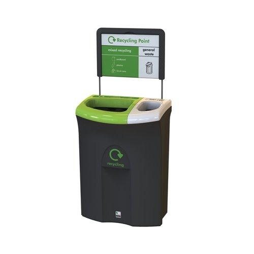- Meridian Envirobin 110 litre double with black base, lime green open left lid with mixed recycling label, white open right lid with general waste label