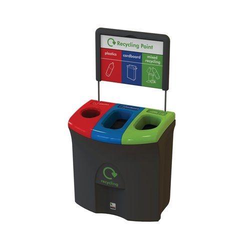 - Meridian Envirobin 87, triple, with black base, red hole left lid with plastics label, blue open middle lid with cardboard label, lime green open right lid with mixed recycling label