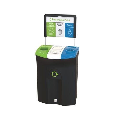 - Meridian EnviroBin Triple 110 litre triple, with black base, lime green hole left lid with mixed recycling label, white middle lift lid with general waste label, blue liquids right lid with liquids label
