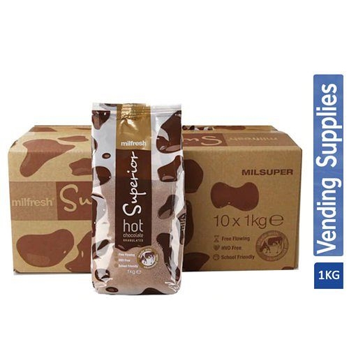 - Complies With School Foods Trust GuidelinesProduct informationMilfresh Superior Hot Chocolate is made with rich cocoa and a dash of skimmed milk which delivers a sublimely indulgent hot chocolate drink. Free flowing granulated chocolate powder.Suitable for use in vending machines or straight from the bag with hot water. This product is free from Hydrogenated Vegetable Oils (HVO's) and fully complies with School Foods Trust Guidelines.Milfresh Superior Hot Chocolate Ingredients:Sugar, Whey Permeate‚ (Milk), Fat-reduced Cocoa Powder (12%), Skimmed‚ milk‚ powder, Coconut Oil, Dried Glucose Syrup, Salt, Stabilisers (E466, E412, E34oil, E452i),‚ milk‚ proteins, Flavouring, Emulsifier (E471), Anti-Caking Agent (E551).‚