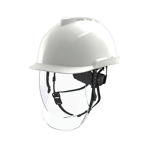 Balanced lightweight electricians safety helmet, non-vented, with 6-point Fas-Trac III ratchet suspension and GS-ET-29 class 1 face shield certified for protection against arc flash. For use where top impact hazards to the head, chemical splash, Ultra-Violet radiation, molten metal splash or electric arc to the face exist.