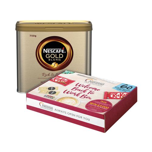Nescafe Gold Blend is made from a mix of Arabica and Robusta beans combined to create a smooth coffee that tastes bold and luxurious. Carefully selected, medium-roasted and freeze-dried to lock in flavour, this may be instant coffee, but that doesn't mean it lacks in taste. Sold in a premium 750g catering tin with click-to-close technology to lock in flavour and keep the coffee tasting fresh, this coffee will keep your workforce running at full strength. With this promotion you receive this Nestle Mixed Box Always Open For You free, the box contains 15 each of Nescafé Cappuccino and Nescafé Latte sachets; 30 Kit Kat 4 finger snack bars with information and tips on how to take mental and physical breaks.