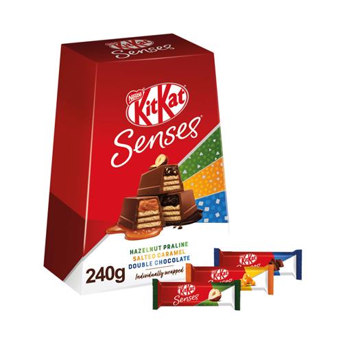 A mixed selection of Nestle KitKat Senses indulgent bitesize pieces. Deliciously crisp chocolate-covered wafers with indulgent fillings. Contains three varieties: hazelnut praline, salted caramel and double chocolate, all individually wrapped. Bring everyone together with KitKat Senses sharing box. 240g box.