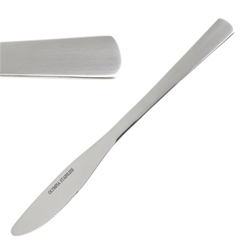 Complement modern table settings with these knives from Olympia's Clifton collection. Supplied in a pack of 12, the table knives feature an uncomplicated design that looks stunning on the table and offers a good feel and balance in the hand. The table knives are made from solid 18/0 stainless steel which has received multiple levels of polishing and buffing to give a deep shine.