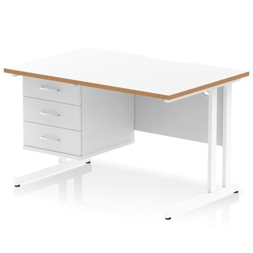 Oslo 1200 x 800mm Scalloped Edge Straight Office Desk White Top Natural Wood Edge White Cantilever Leg Workstation 1 x 3 Drawer Fixed Pedestal